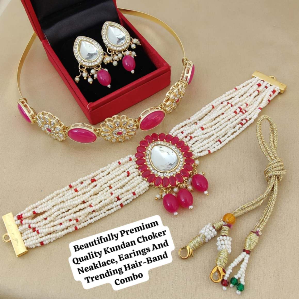 Kundan Choker Necklace With Earings And Trending Hairband Combo