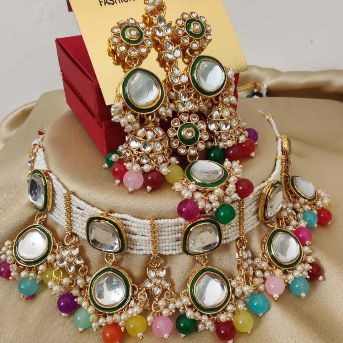 Kundan choker necklace with jhumkie earrings, tikka combo