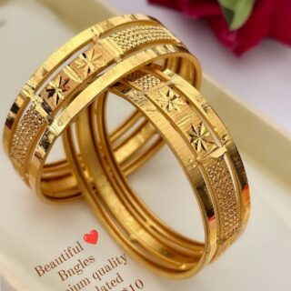 Elevate your traditional attire with the Royal Radiance Bangles from Lakwin Jewels. These bangles exude the opulence of real gold, meticulously crafted to offer a luxurious appearance without the hefty price tag. Their intricate design and radiant finish make them a perfect accessory for festive occasions, weddings, or daily wear.